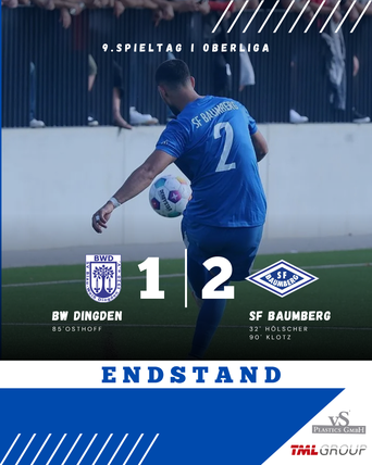 Am 9. Spieltag der Oberliga Niederrhein waren die Sportfreunde Baumberg beim Aufsteiger BW Dingden zu Gast. Nach einer halben Stunde brachte Timo Hölscher die Gäste verdient in Führung. Die Partie blieb anschließend offen, beide Teams erspielten sich Chancen. Kurz vor Schluss gelang Dingden der Ausgleich – doch die Sportfreunde hatten die passende Antwort parat: Kapitän Louis Klotz traf in der 90. Minute zum 1:2-Endstand. Mit diesem späten Sieg klettern die Baumberger in der Tabelle auf Platz zwei.