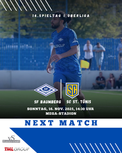 Das nächste Heimspiel der Sportfreunde Baumberg ist am Sonntag, 16. November gegen den SC St. Tönis. Anpfiff im MEGA-Stadion ist um 14:30 Uhr.