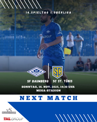 Nach der Niederlage am vergangenen Wochenende wollen die Sportfreunde Baumberg im heimischen MEGA-Stadion wieder ein Ausrufezeichen setzen. Während die Baumberger zuletzt gegen den VfL Viktoria Jüchen-Garzweiler ihre vierte Saisonniederlage hinnehmen mussten, reist St. Tönis mit Rückenwind an: Ein klarer 7:1-Erfolg gegen Adler Union Frintrop brachte das Team von Trainer Bekim Kastrati auf 17 Punkte und ins Tabellenmittelfeld. Besonders in der Offensive zeigte sich der Gast bislang treffsicher – 33 Tore sprechen für sich. Fünf Siege, zwei Remis und sechs Niederlagen stehen auf dem Konto. Auch die Sportfreunde können auf eine starke Angriffsreihe bauen, die im Schnitt mehr als zwei Treffer pro Spiel erzielt. In der Tabelle trennen beide Mannschaften lediglich vier Punkte.