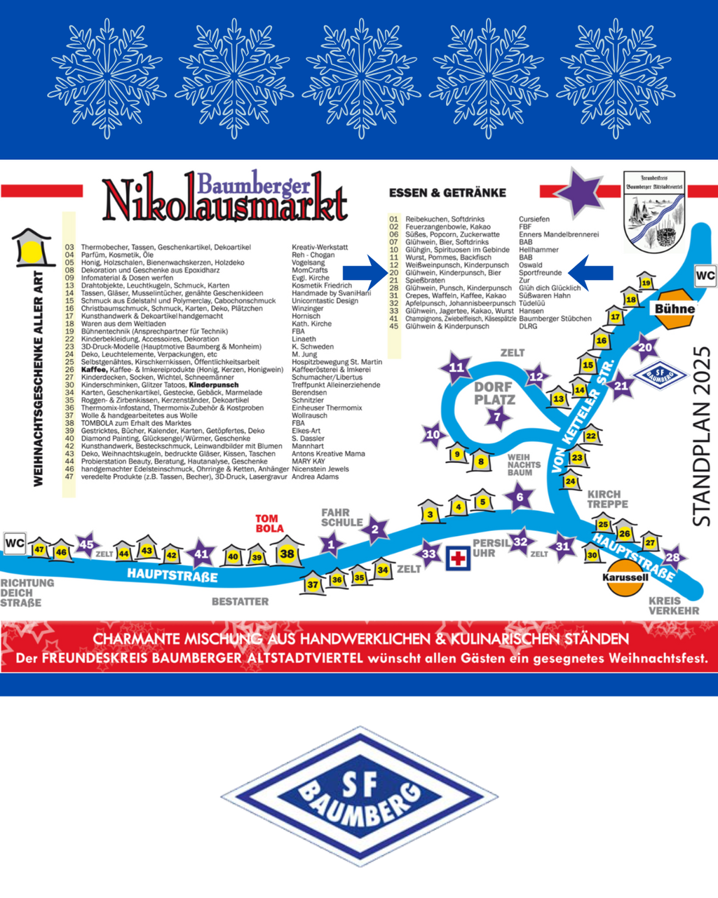 Am 6. und 7. Dezember 2025 findet der traditionelle Nikolausmarkt in Baumberg statt. Auch in diesem Jahr sind die Sportfreunde Baumberg mit einem eigenen Stand vertreten und beteiligen sich damit erneut an einem der beliebtesten vorweihnachtlichen Ereignisse im Stadtteil. Besucherinnen und Besucher finden den Verein am Stand Nr. 20 (direkt neben der großen Bühne).
